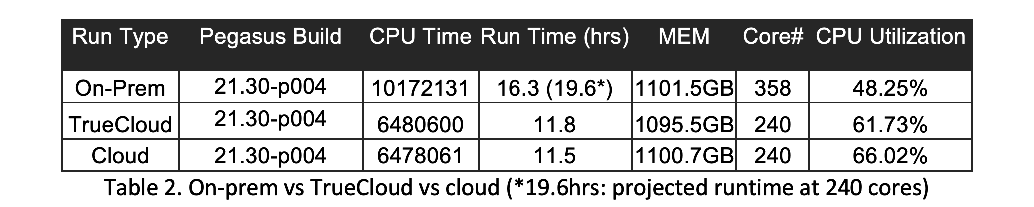 For this design, Cadence observed a 40 percent turnaround time improvement for Pegasus Physical Verification with TrueCloud versus on-premises. Also, there was no significant difference between Pegasus Physical Verification with TrueCloud versus a traditional cloud run (rows 2 and 3 in table 2), which proves the efficiency of using this model.