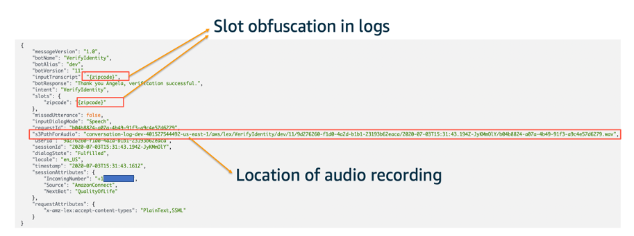 For Amazon Lex, we discussed the Lex conversation logs feature in the previous section, which adds auditability to Lex bots in your application. If you enable conversation text logs in Lex, one helpful feature for protecting sensitive PII is Slot Obfuscation. When enabled, Amazon Lex replaces the value of the slot with the slot name in conversation logs. You can see this obfuscation in action in the example CloudWatch Logs entry:
