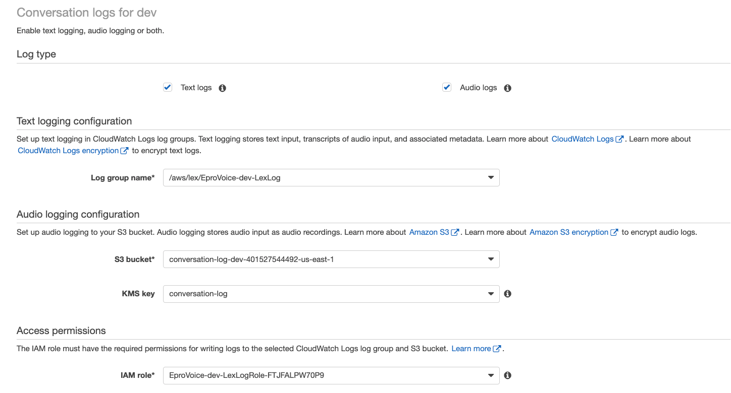 The following image shows the Lex console UI enabling the two types of logs respectively. Note that both the audio and text logs can be configured to use customer managed Amazon KMS encryption keys for additional security compliance.