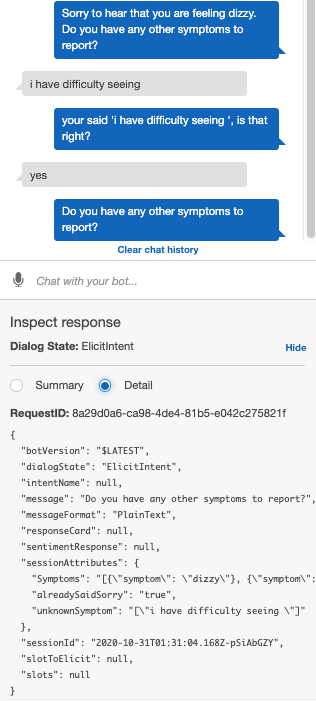 However, even with a thorough set of sample utterances in place, the bot could still fail to interpret the user from time to time. You should have a plan for gracefully handling errors. One way to do this is by using the built-in fallback intent from Lex. When the bot could not map the user’s input to any of the custom intents defined in the bot, and a fallback intent is defined, the bot custom logic you define to handle a fallback intent. In our sample application, we programmed the fallback intent for the symptom collection bot to confirm the user’s input by simply repeating it back to them. If the user says “yes”, the system can simply store the entire utterance into the reporting database as a symptom with an “unknown” flag and move on with the conversation. This allows alerting a system admin to review the unknown input after the fact without interrupting the current user reporting flow.
