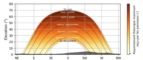 The report includes a shading analysis that overlays the sun’s trajectory throughout the year with potential obstructions. Using color gradients from yellow to dark orange, it shows the theoretical maximum radiation intensity, helping solar panel owners understand how shadows from nearby buildings or terrain features impact their production at different times of the day and year.