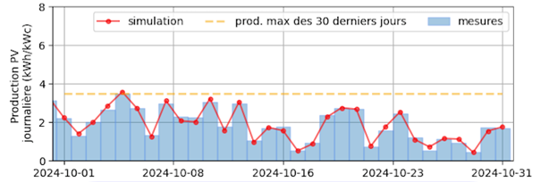 Figure 3. Daily solar production over the past 30 days: actual measurements (blue bars) compared to simulated output (red line), with maximum production over the period (orange dashed line)