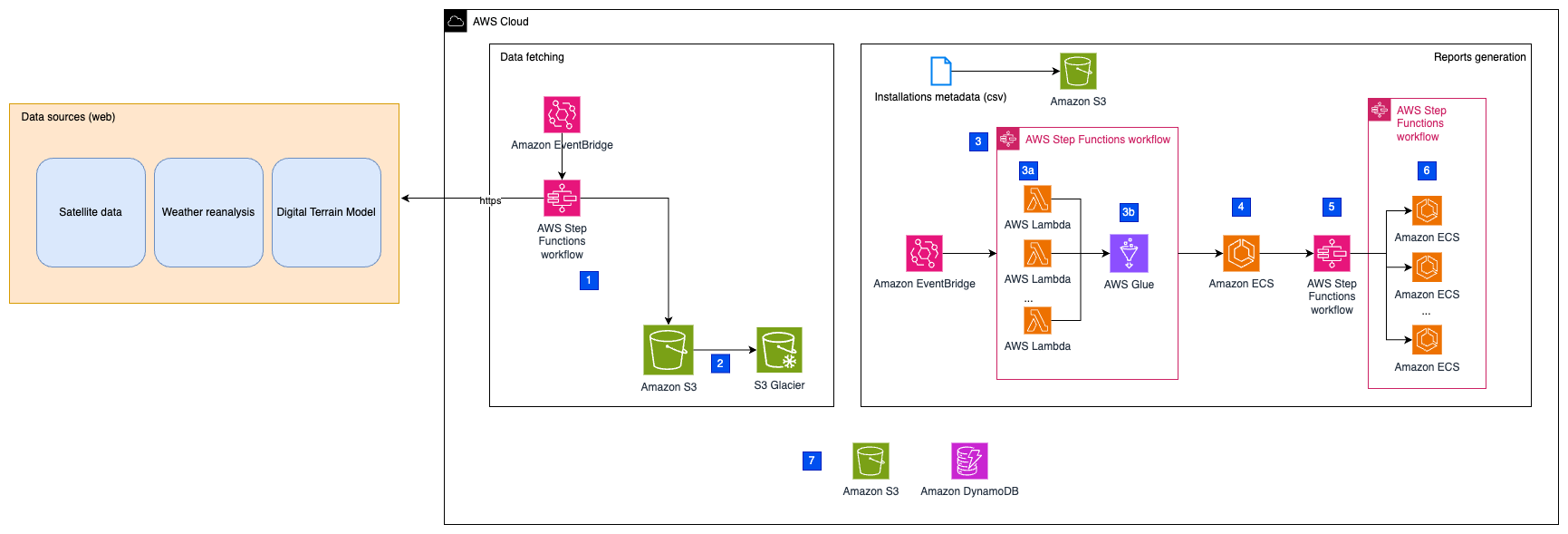 Amazon DynamoDB tracks the processing status and stores calculation parameters, particularly those used for comparing installations with each other. Amazon S3 stores the data generated at each step of the process, providing a reliable, cost effective, and scalable storage solution.