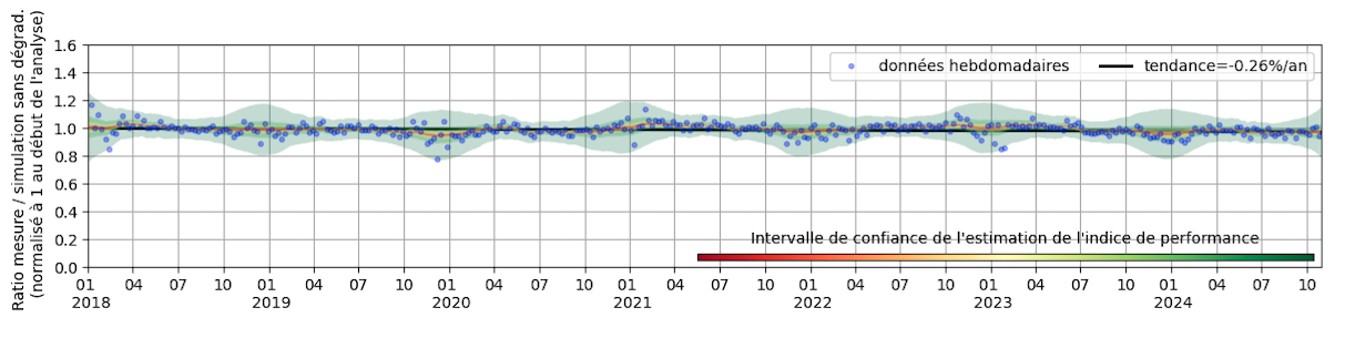 The report tracks installation efficiency over time through a performance ratio analysis. This visualization presents weekly performance points, a ratio comparing measured production to simulated expectations, with a black trend line from a robust regression. Color-coded confidence intervals in green indicate the expected performance range, while red zones highlight periods of significant underperformance that may require attention. The system calculates annual degradation rates from the regression slope, helping producers understand their panels’ aging process and compare it to industry standards.