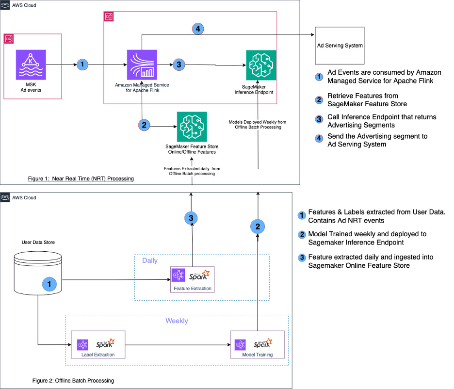 The solution has a near real-time (NRT) processing component for the prediction of user segments and an offline processing component for feature extraction and training of models. The NRT component handles billions of events per day. It filters and aggregates the events to reduce the number of calls to the Amazon SageMaker AI Inference endpoints from billions to hundreds of millions. The end-to-end latency –from event ingestion to the user segment becoming available to the ad server– is a few minutes.