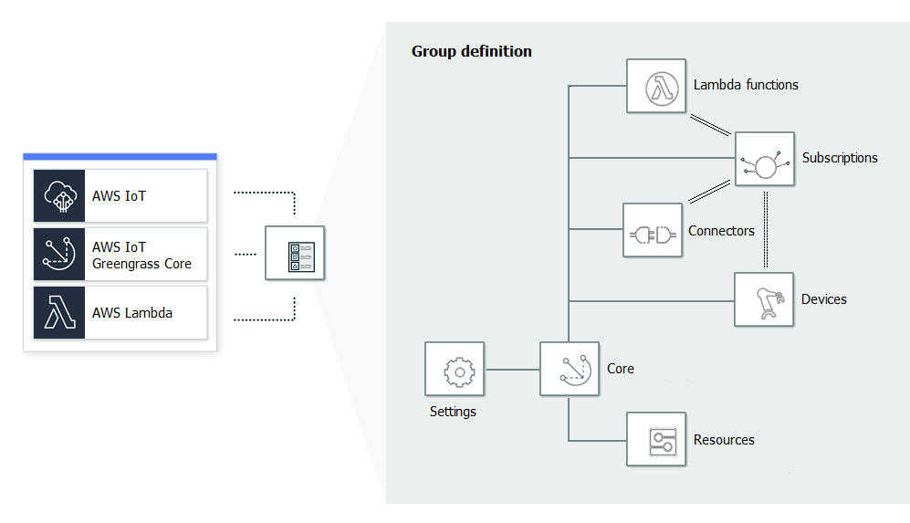 A Greengrass group definition is a collection of information about the Greengrass group, which in turn maps to a Greengrass deployment, AWS IoT Core, and other AWS resources, such as AWS Lambda functions. AWS CloudFormation can be used to create a Greengrass core, Lambda functions, and subscriptions resources. Although connectors, devices, and resources are not used in the AWS CloudFormation template for this post, they can be defined and created by AWS CloudFormation, too.