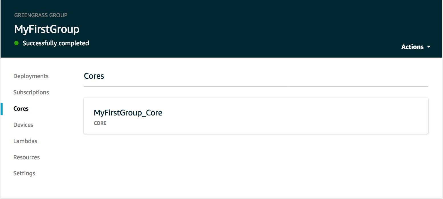 - Open the AWS IoT console and choose Greengrass, Groups, MyFirstGroup, and then Cores, you should see your core device: