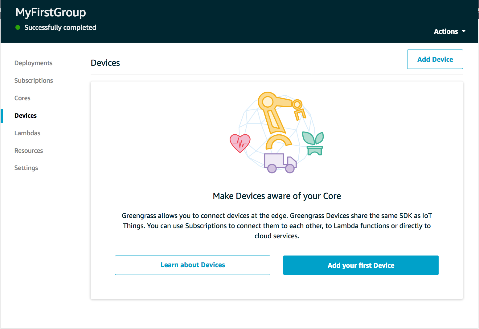 You should now have the AWS IoT Greengrass Core software running on a gateway. If you followed the steps in the Getting Started modules, you should also have a Greengrass group (for example, MyFirstGroup) with one core device (for example, MyFirstGroup_Core) configured. The core device should be able to communicate with AWS IoT Core.