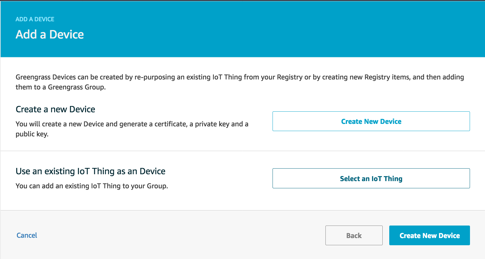 - In the AWS IoT console, choose Greengrass, choose Groups, and then choose your group to open its configuration page. Next, choose Devices, and then choose Add your first Device (or Add Device).