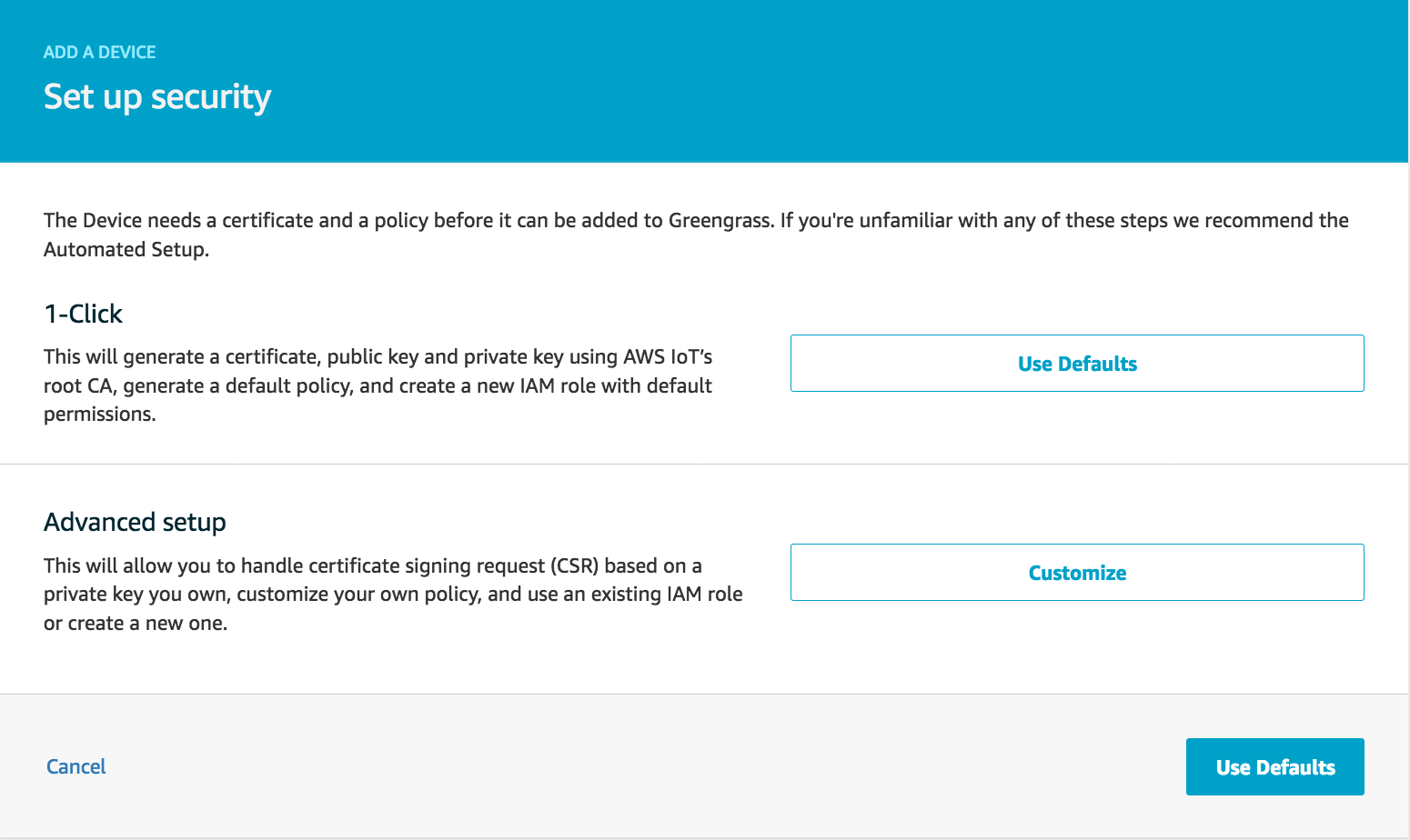 - On the Set up security page, choose Use Defaults to use the 1-Click option. This option generates the required keys and certificates using the AWS IoT root CA and creates a default policy and IAM role with default permissions.