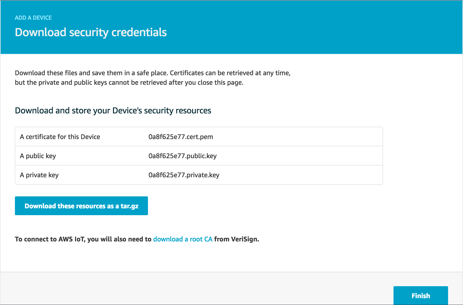 - On the Download security credentials page, download the certificates for your device into a kepserver_certificates folder, and then extract them. Be aware that this is the only step in the process when you can download keys (so make sure you download them here or you will have to create a new AWS IoT device). Choose Finish.
