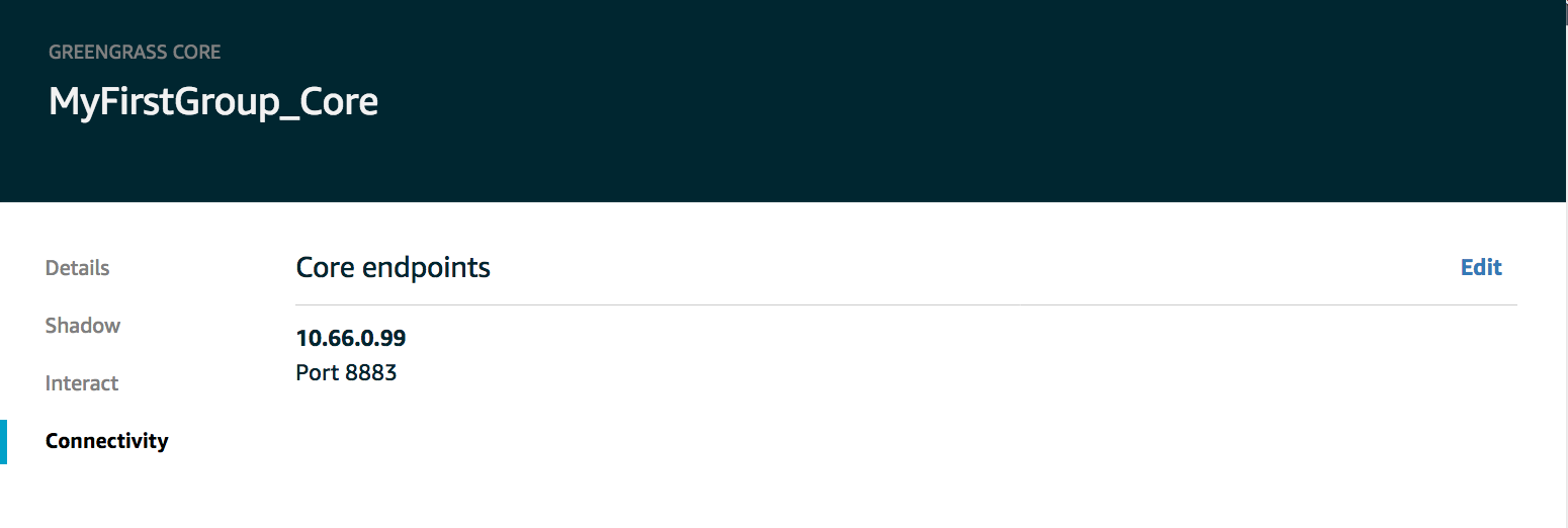 - Choose your core device, and in the left pane, choose Connectivity. Make a note of the endpoint address and port.