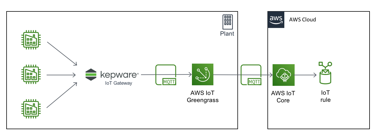 - KEPServerEX supports OPC UA and MQTT (stock implementation). We use MQTT messages to communicate with AWS IoT Greengrass.