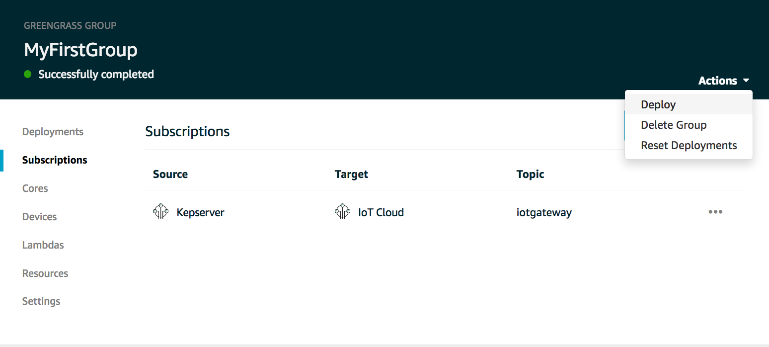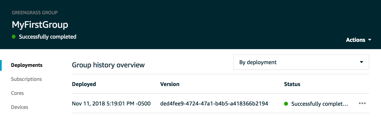 - On the group configuration page, from the Actions menu, choose Deploy to deploy the updated group configuration to your Greengrass core device: