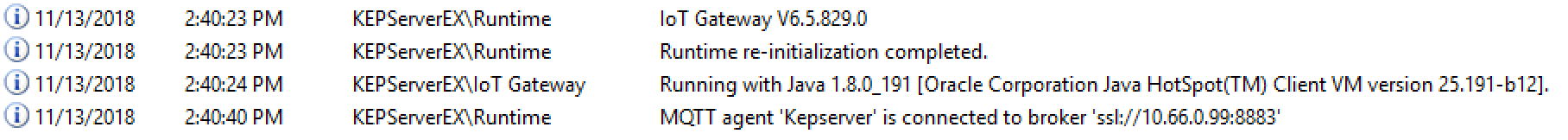 - In the event log window, you should see a message that confirms the MQTT Agent KEPServer is connected to the Greengrass core device: