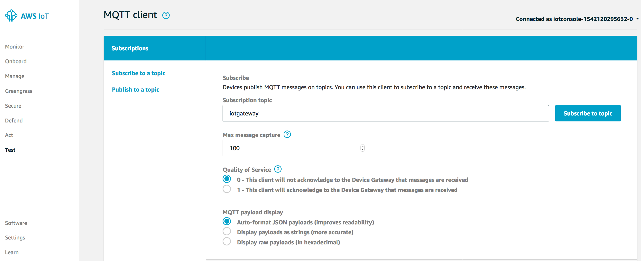 To test the topic subscription, in the left pane of the AWS IoT console, choose Test.