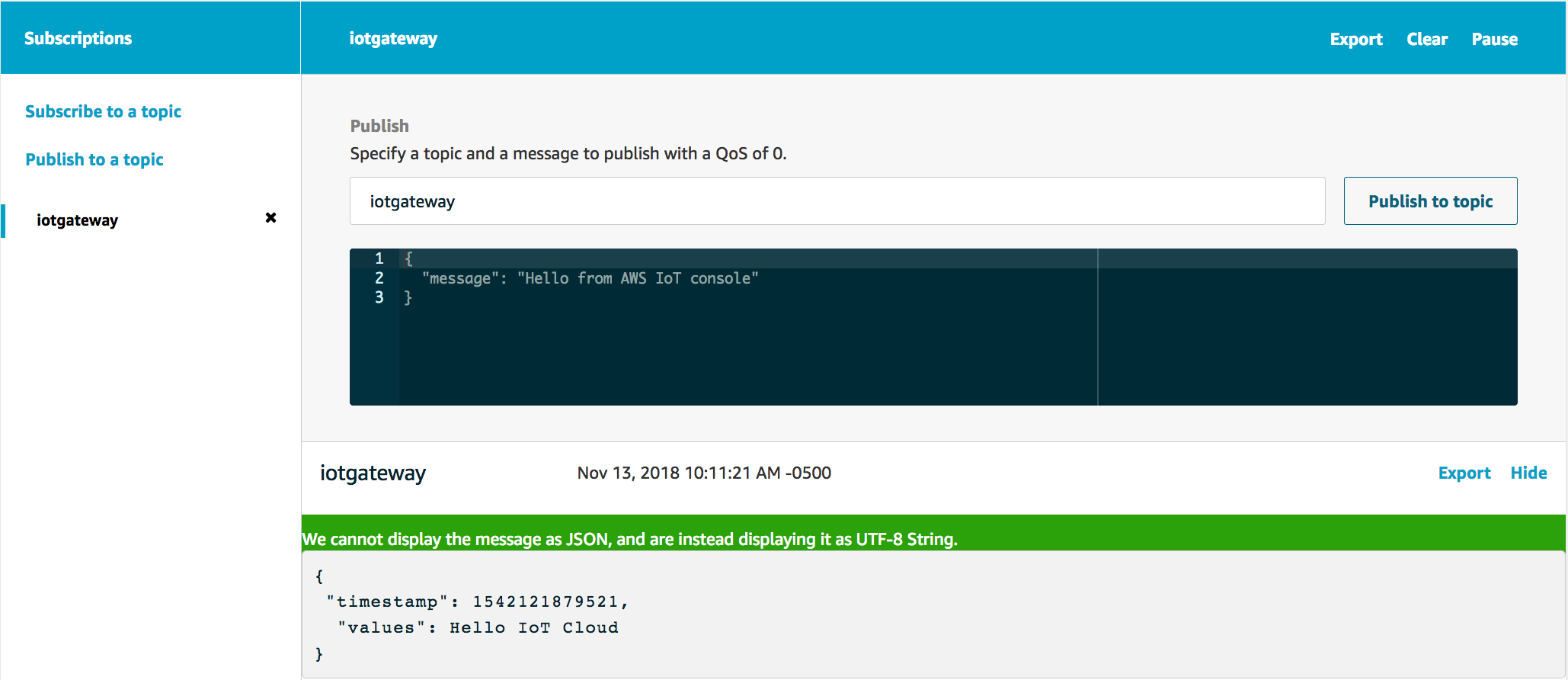 Both the KEPServerEX and Greengrass group are now configured. In this step, we verify that the connection from KEPServer is successful, and then subscribe to the topic in AWS IoT Core.