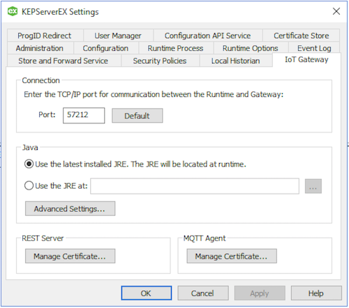 - To access the IoT gateway system settings, right-click the Administration icon in the system tray, and then choose Settings. Choose the IoT Gateway tab.