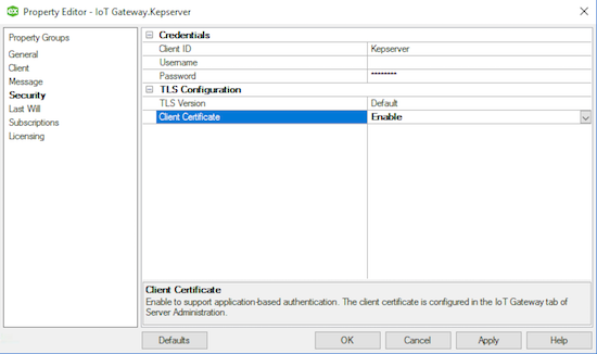 - Go to Security, and modify the TLS configuration so the KEPServer client sends its certificate: