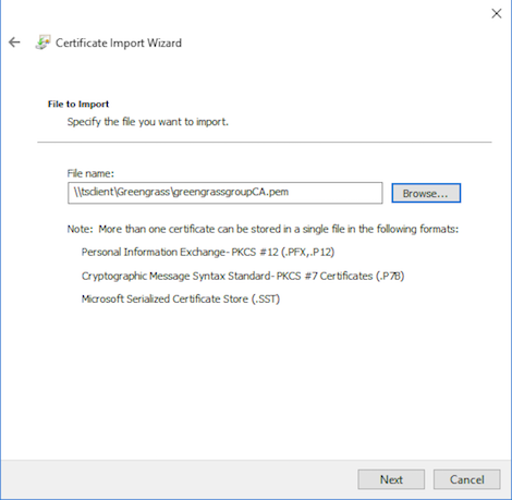 - On the Import Wizard page, choose Next. Browse your local folder, or the shared folder where you saved the greengrassgroupCA.pem file, and choose Open.