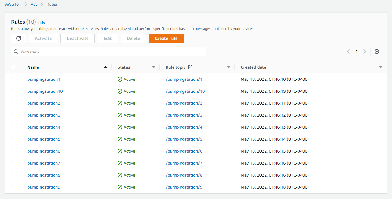 This script creates the IoT rules to ingest the simulation data into AWS IoT SiteWise. (Note: The policy used for this demonstration is over permissive and shouldn’t be used in a production environment, for more information on scoping down policies check this AWS IoT policies overly permissive) - Now navigate to AWS IoT Core → Message Routing→ Rules