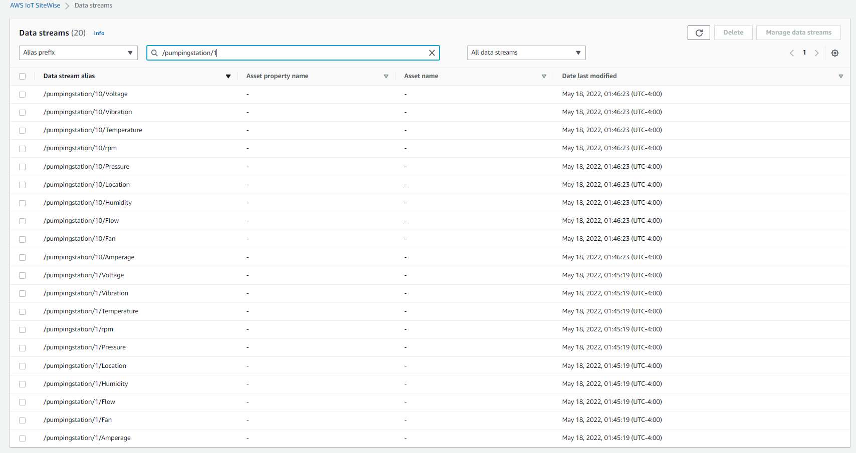 AWS IoT SiteWise Data Streams is where ingested data, which is not yet assigned to an asset is automatically stored. For more information on Data Streams follow this link. Now verify the data arriving in AWS IoT SiteWise and being update periodically, you can also filter through all Alias prefix, use the /pumpingstation/{n} and All data streams to observe the data.