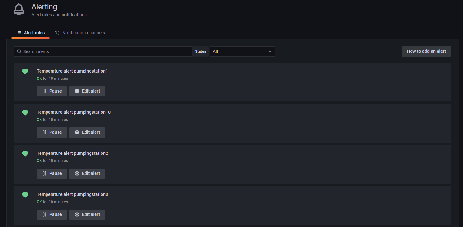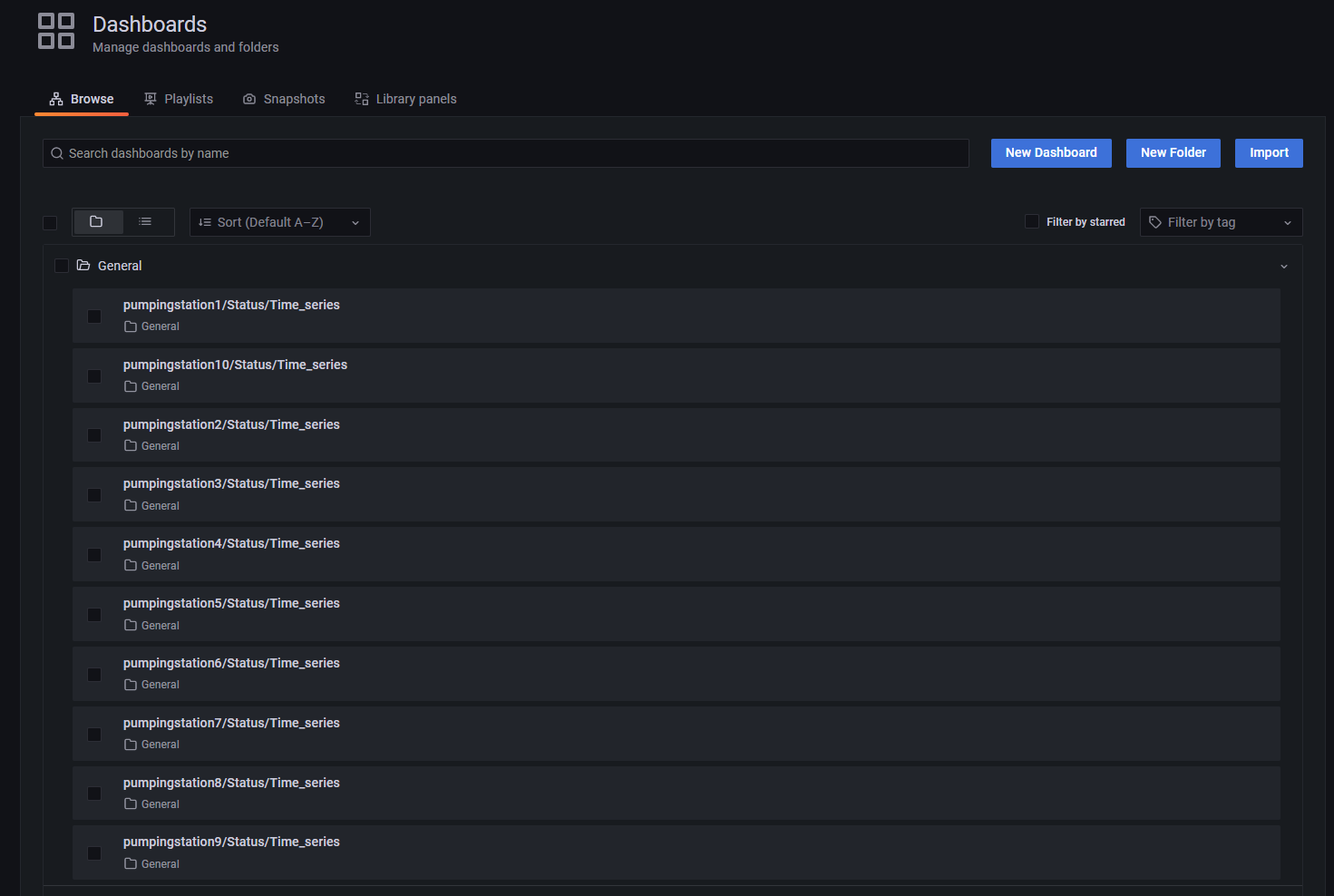 For the monitoring dashboards and alerts we have created a python script which will automatically deploy one dashboard for each pumping station.