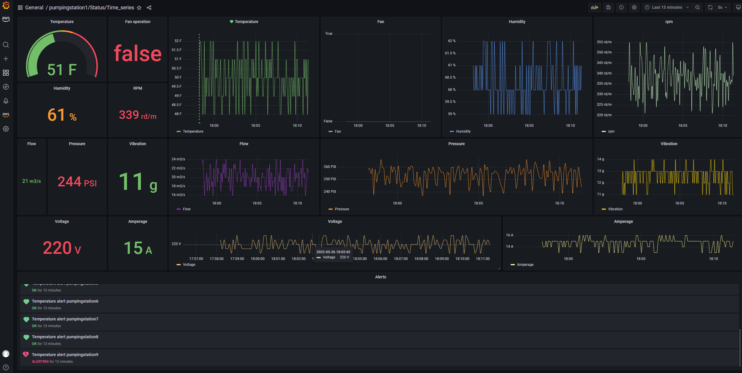 - Navigate to pumpingstation9/Status/Time_series dashboard and confirm the temperature is high, and the alert is active. For this simulation data set, the Pumping Station 9 presents the anomalous temperature and triggers an alert to the notification channel every 2 minutes. Optionally navigate to any other pumping station dashboard and compare them.
