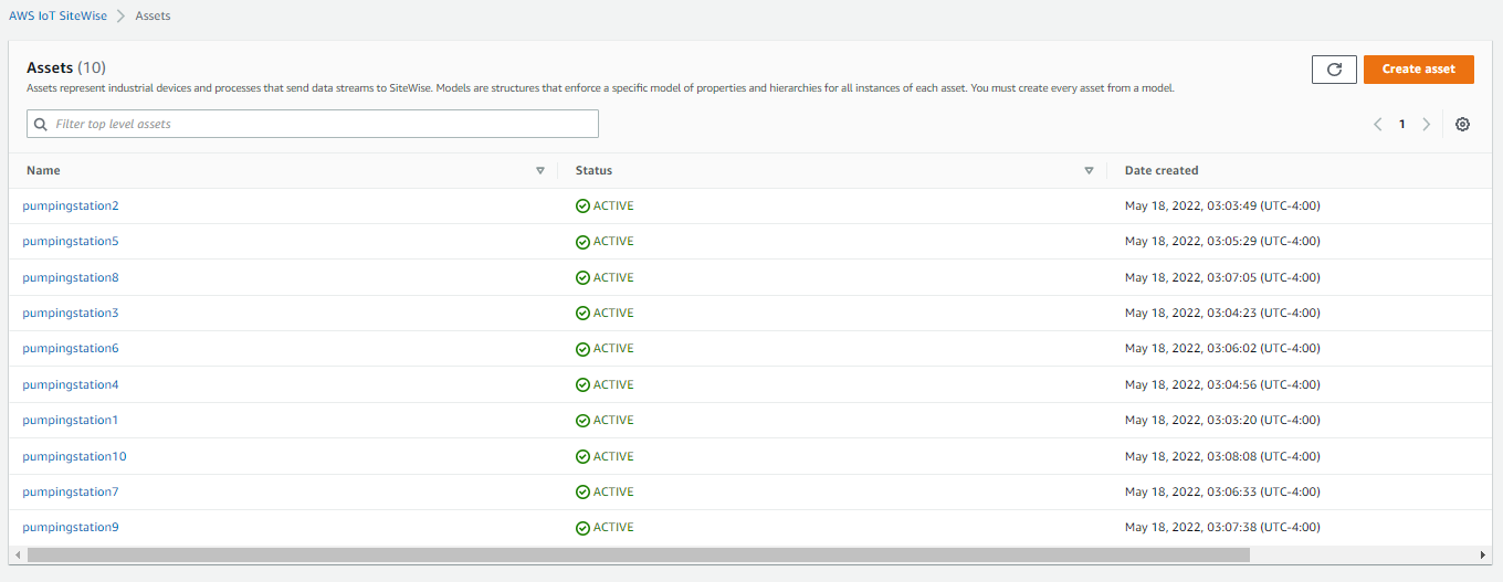 The Script will run for about 5 minutes. You can watch the responses from the AWS CLI commands. - Go to AWS IoT SiteWise→ Assets and confirm that all pumping stations were created and are active as below.