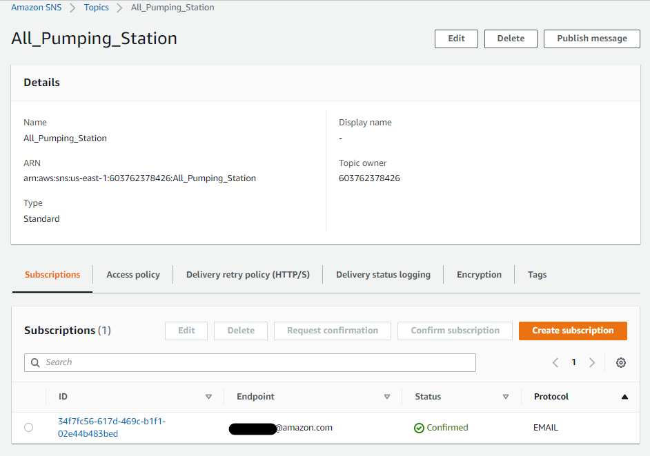 - Topic : <Paste the topic ARN from the previous section>. If you need to locate it again, Navigate to Simple Notification Service→ Topics→ all_pumping_stations, the ARN is located under details.