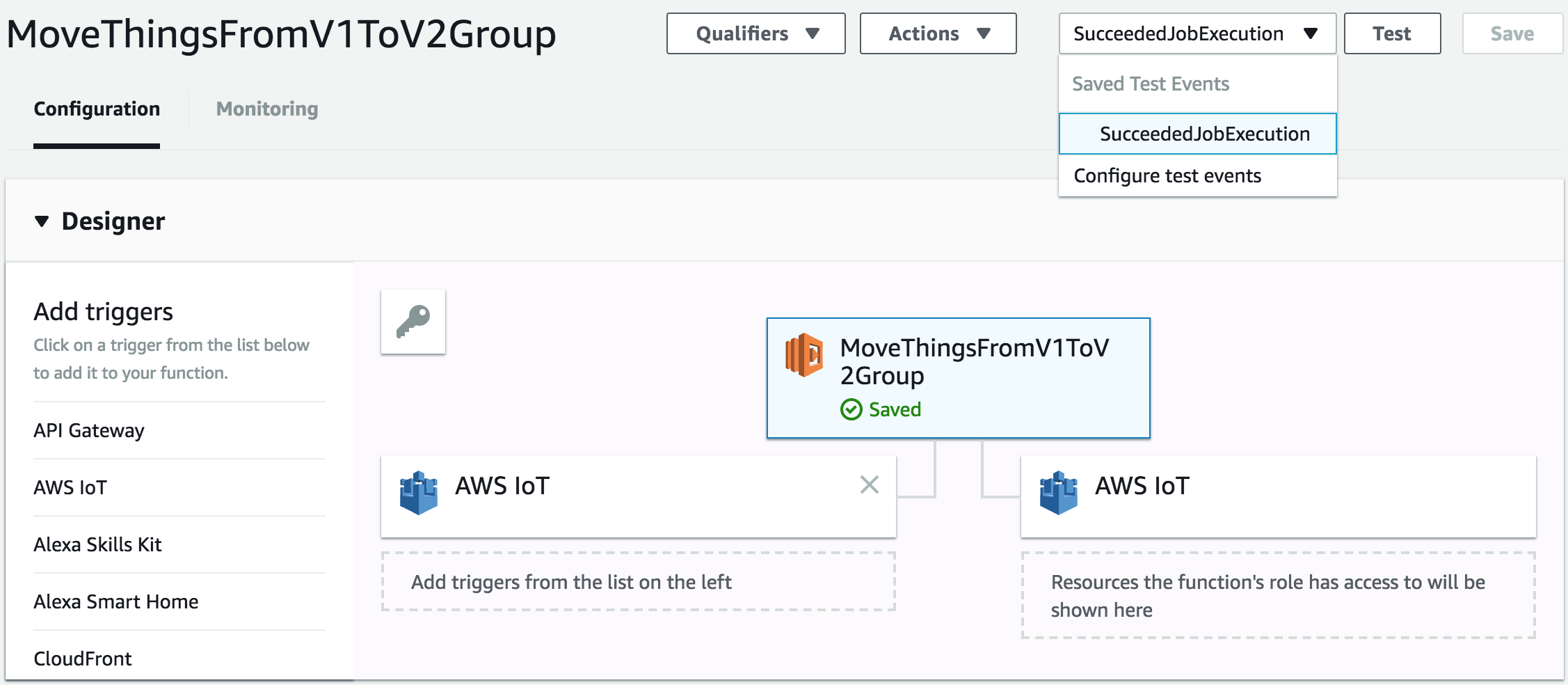 After you have created the test event, you are directed back to the AWS Lambda console. Select the SucceededJobExecution test event, and choose Test. You should see the thing MyRaspberryPi is removed from FirmwareV1Group and add to FirmwareV2Group from AWS IoT console. For information about creating a Lambda function and how to monitor and debug a Lambda function with CloudWatch, see Create a Simple Lambda Function in the AWS Lambda Developer Guide.