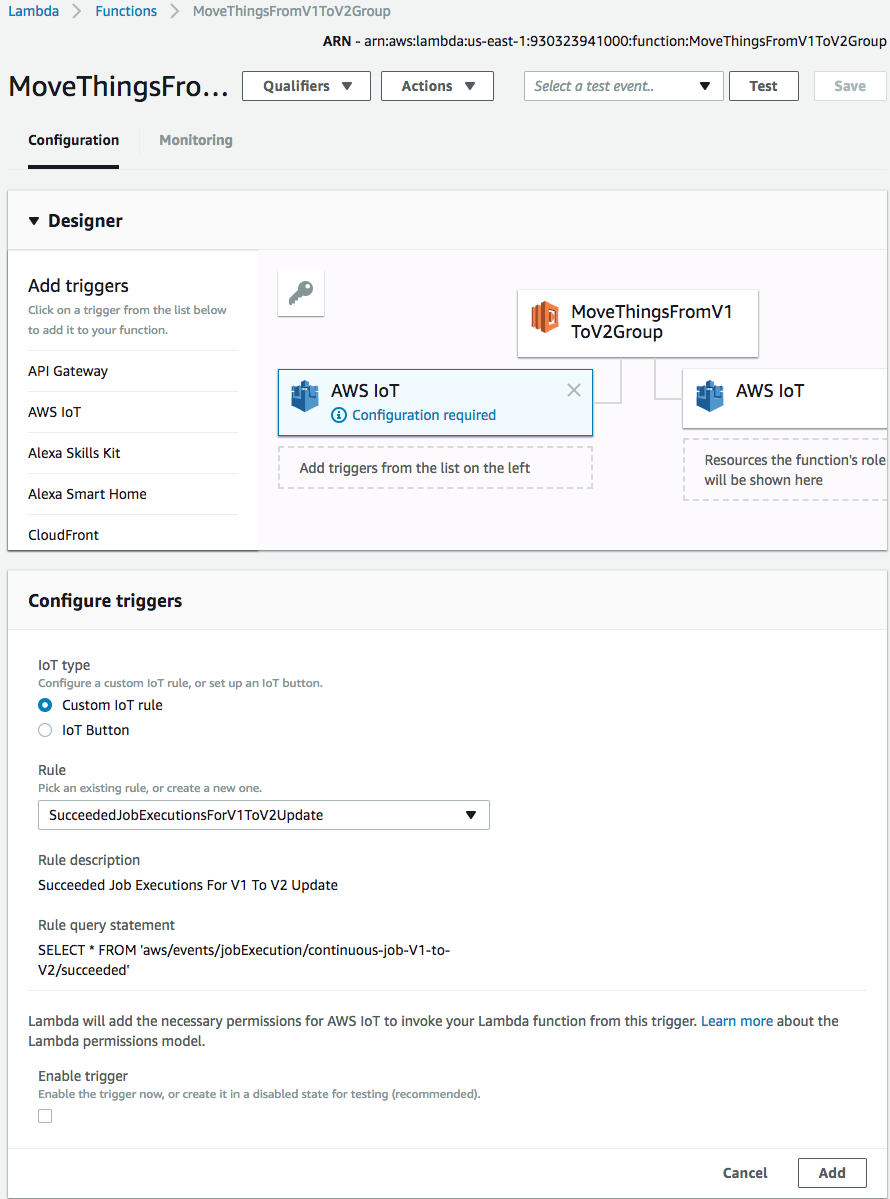 To configure the trigger for this Lambda function, under Designer, choose AWS IoT. In the Configure triggers section, we will create a custom IoT rule to filter succeeded job executions events for a continuous job with the job ID continuous-job-V1-to-V2. To learn more about Job Events, see Job Events documentation in the AWS IoT Developer Guide. Create a new rule named “SucceededJobExecutionsForV1toV2Update”, and input the following SQL statement for the Rule query statement: