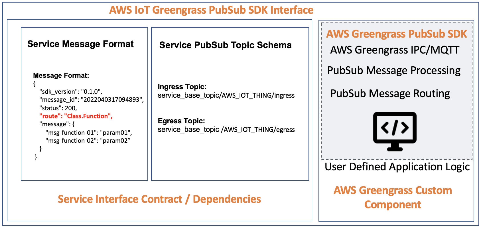 - Messaging Service Boilerplate Code: The SDK abstracts the AWS IoT Greengrass IPC and MQTT PubSub functionality to process and route PubSub messages to user-defined application call-backs.