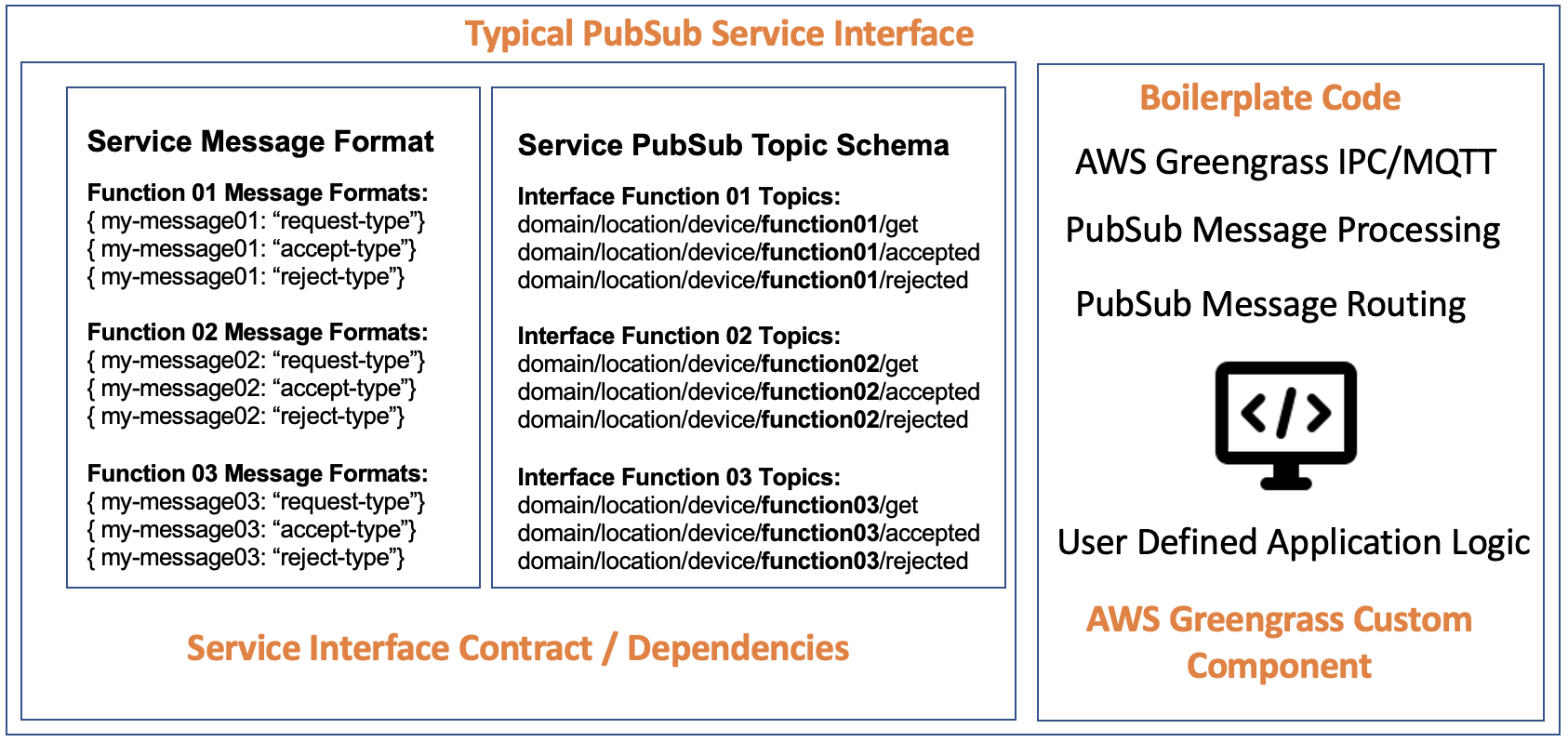 The AWS IoT Greengrass PubSub SDK for Python (referred to here as the SDK) provides a highly opinionated IoT PubSub application architecture delivered as a Python library for AWS Greengrass V2 Components. The SDK abstracts the AWS IoT Greengrass PubSub functionality and defines a data-driven message format to automatically route AWS IoT Greengrass IPC / MQTT messages to user defined application call-backs. In doing so, the SDK delivers a No/Low-Code messaging service that decouples the PubSub topic schema from the desired interface functionality.