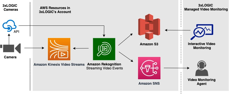 When a 3xLOGIC camera detects motion, it starts streaming video to Amazon Kinesis Video Streams and calls an API to trigger Amazon Rekognition to start analyzing the video stream. When Amazon Rekognition detects a person in the video stream, it sends an event to Amazon Simple Notification Service (Amazon SNS), which notifies a video monitoring agent of the event. Amazon Rekognition provides out-of-the-box notifications, which include zoomed-in images of the people, bounding boxes, labels, and timestamps of the event. Monitoring agents use these notifications in concert with live camera views to evaluate the event and take appropriate action. To learn more about Amazon Rekognition Streaming Video Events, refer to the Amazon Rekognition Developer guide.