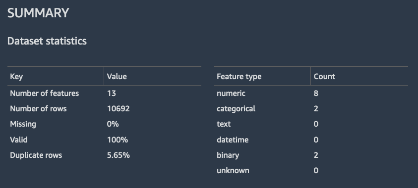 - Summary statistics – This section provides insights into the number of rows, features, % missing, % valid, duplicate rows, and a breakdown of the type of feature (e.g. numeric vs. text).