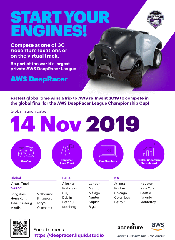 Accenture has a rich history of helping customers all over the world build artificial intelligence (AI) and machine learning (ML) powered solutions with AWS services. In doing so, they always look for new and engaging ways to develop their teams with the appropriate level of enablement and hands-on training. Accenture’s next ML initiative is rolling out their version of an AWS DeepRacer League, which is the world’s first global autonomous racing league launched by AWS at re:Invent in 2018. Accenture’s league spans 30 global locations and 17 countries, with each location featuring both a physical and virtual track to compete on for the title of Accenture AWS DeepRacer Champion.