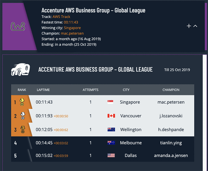 Multiple individuals and groups within Accenture signed up to become private preview customers with access to the AWS DeepRacer console in preparation for the launch of their global competition. They have also begun building their own leaderboard that is integrated into the Accenture single sign on, to use for every site’s competition. Accenture participants in each city can create competitions, track their leaderboard, join competitions in other cities, and upload video recordings from their blazing fast laps to claim victory.