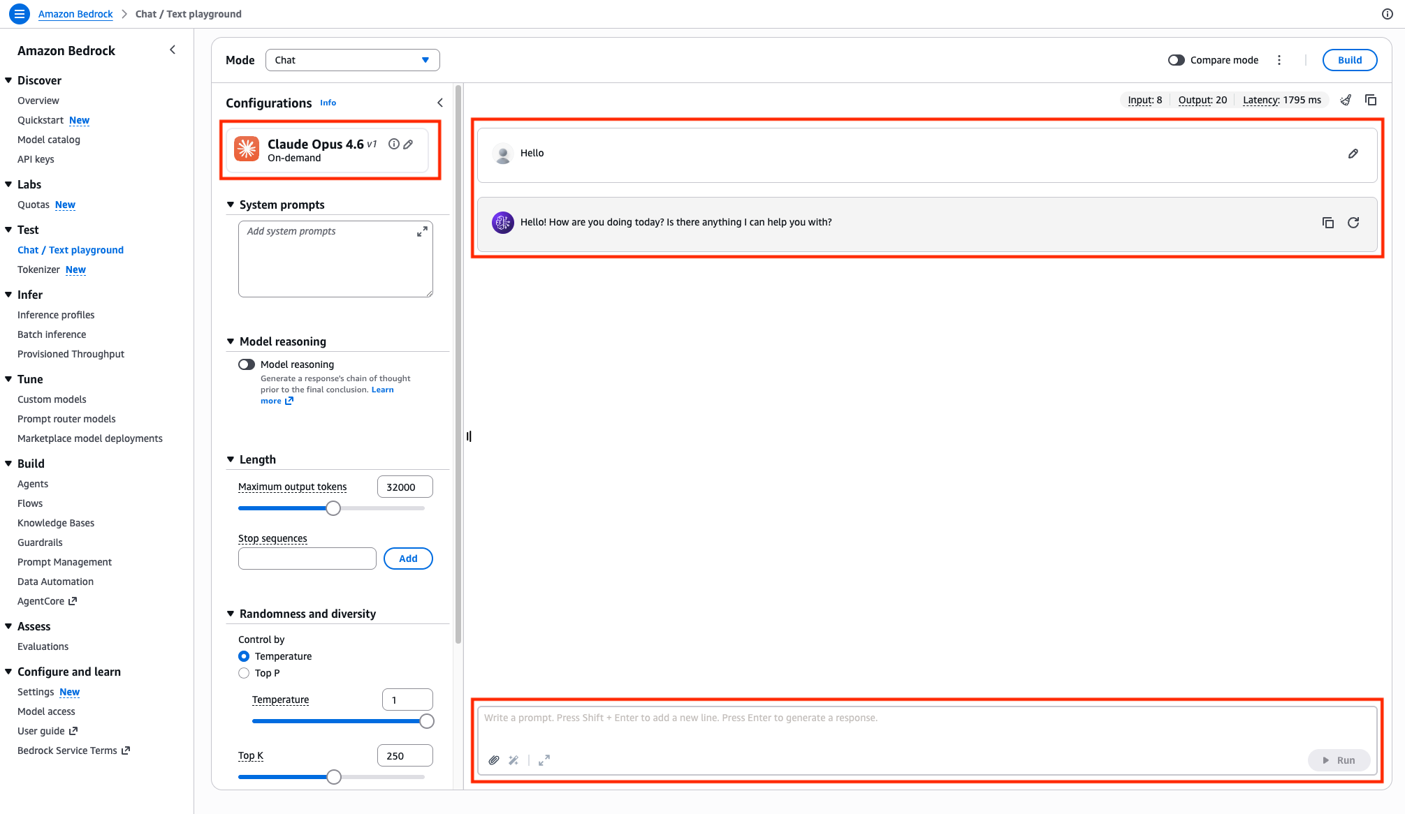 - You can start inferencing the model on Amazon Bedrock chat / text playground, by trying out some prompts