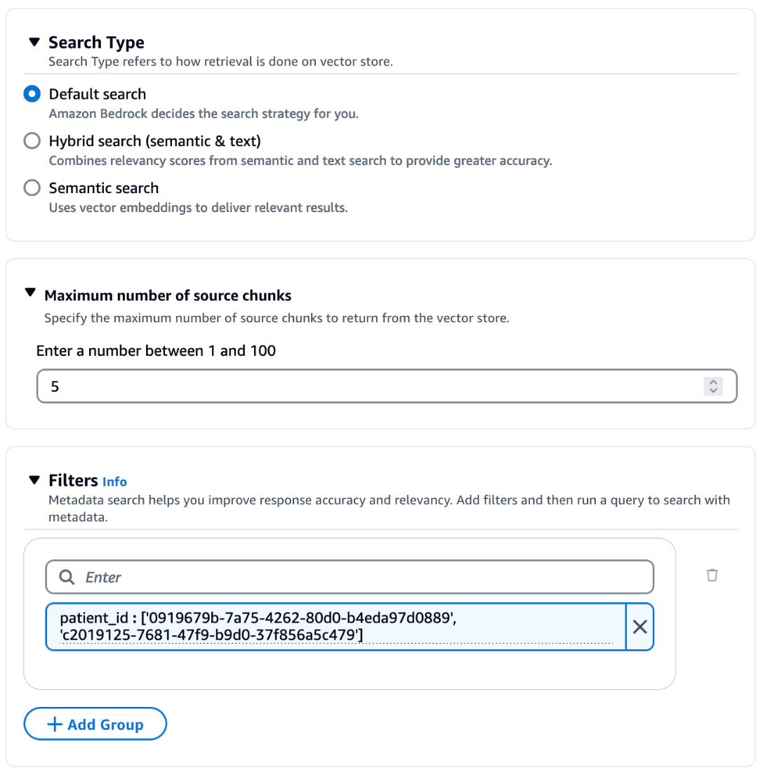 To demonstrate the access-control capabilities enabled by metadata filtering in knowledge bases, let’s consider a use case where a healthcare provider has a knowledge base that contains transcripts of conversations between doctors and patients. In this scenario, it is crucial that each doctor can only access transcripts from their own patient interactions during the search, and not have access to transcripts from other doctors’ patient interactions.