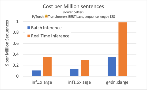 In this application, cost considerations can also impact the final serving infrastructure design. The most cost-efficient way of running the batched inferences is using the inf1.xlarge instance. It achieves 2.3 times higher throughput than the GPU alternative, at 70% lower cost. Choosing between inf1.xlarge and inf1.6xlarge depends only on the main objective: minimum cost or maximum throughput.