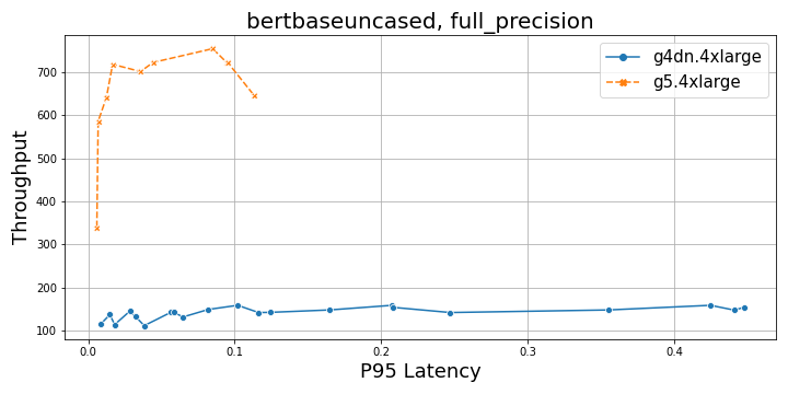 The following graphs compare throughput and P95 latency at full and half precision for BERT.