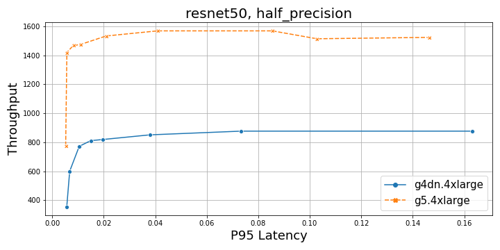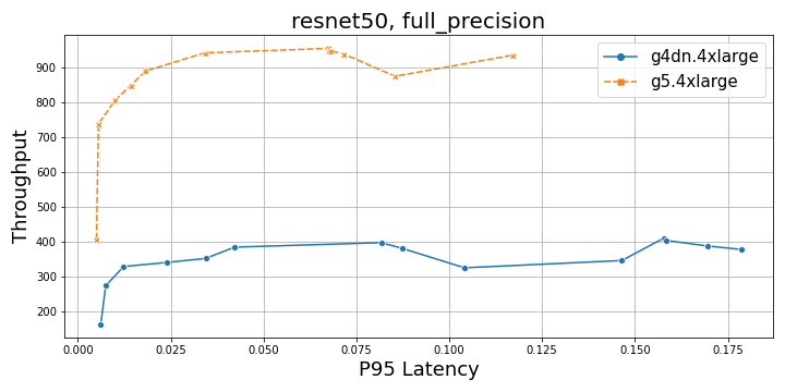 The following graphs compare throughput and P95 latency at full and half precision for ResNet50.