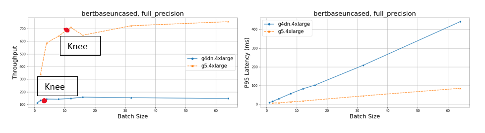 In the following sections, we compare ML inference performance of BERT and RESNET50 models with a grid sweep approach for specific batch sizes (32, 16, 8, 4, 1) and data type precision (full and half precision) to arrive at the throughput vs. latency curve. Additionally, we investigate the effect of throughput vs. batch size for both full and half precision. Lastly, we measure cost per million inferences as a function of batch size. The consolidated results across these experiments are summarized later in this post.
