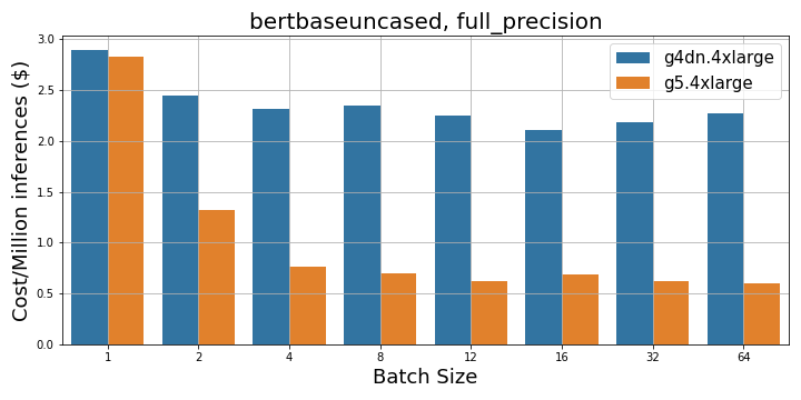 In this section, we present the comparative results of inference costs ($ per million inferences) versus the batch size. From the following figure, we can clearly observe that the cost (measured as $ per million inferences) is consistently lower with G5 vs. G4dn both (full and half precision).