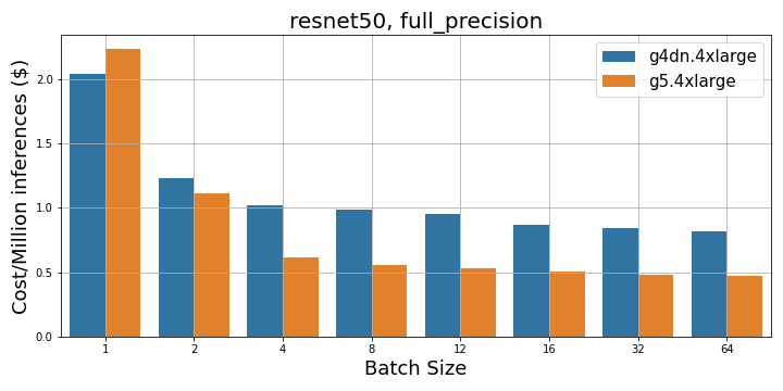 To develop a price-performance study between G5 and G4dn, we need to measure throughput, latency, and cost per million inferences as a function of batch size. We also study the impact of full precision vs. mixed precision. Both the model graph and inputs are loaded into CUDA prior to inferencing.