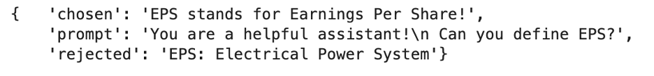 The DPO trainer expects a very specific format for the dataset, which contains sentence pairs where one sentence is a chosen response and the other is a rejected response. This is represented as a Python dictionary with three keys: