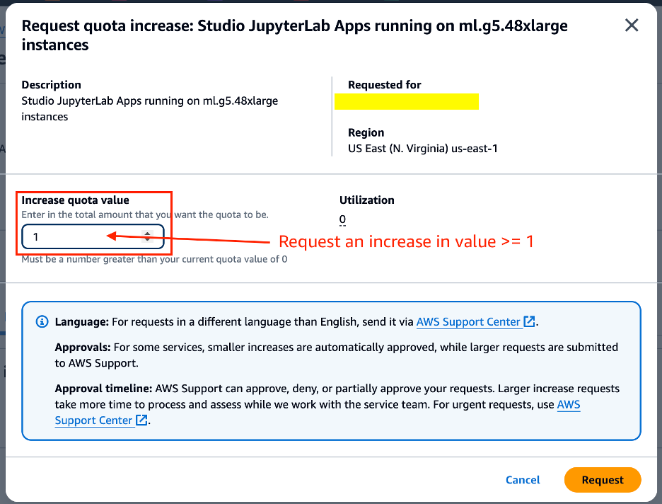 Request an increase in quota value greater than or equal to 1 for experimentation.