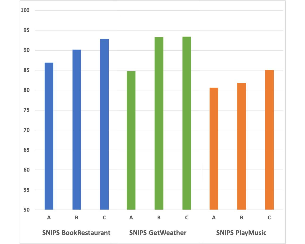 The following column chart shows the distribution of F1 scores for the nine configurations we trained as described in the previous section.