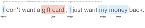 Person,Place,Date,Food, orTaste. - Mentions – The references or mentions of the entity in the document. These can be pronouns or common nouns such as “it,” “him,” “book,” and so on. These are organized in order by location (offset) in the document.